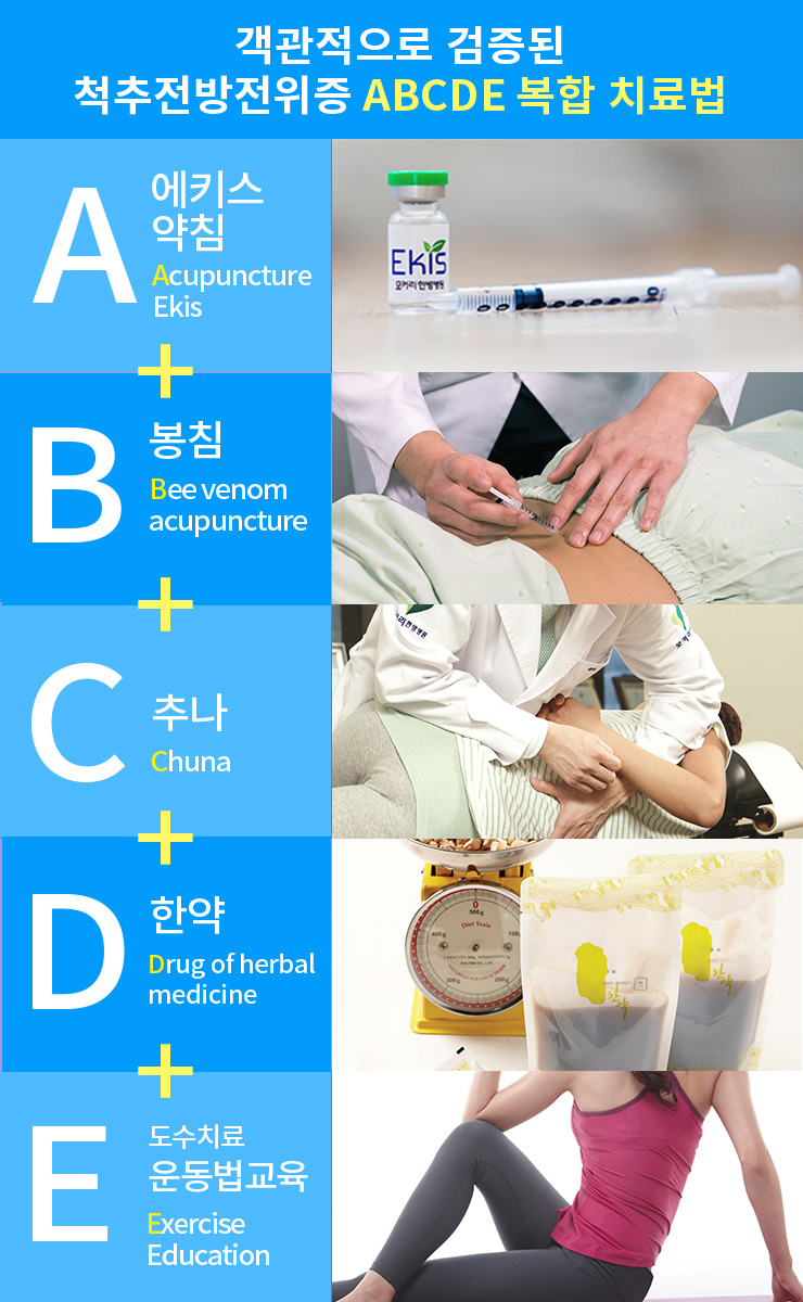 ABCDE 복합치료법이란 에키스약침(Acupuncture)+봉침(Bee venom acupuncture)+추나(Chuna)+한약(Drug of herbal medicine)+도수치료 및 운동법 교육(Exercise / Education)을 통합하여 진행하는 치료법을 의미합니다. 이러한 ABCDE 복합 치료법은 척추전방전위증 치료에 효능이 있는 여러 치료를 복합적으로 동시에 집중적으로 진행함으로써 치료 효과를 더욱 배가시킬 수 있습니다.