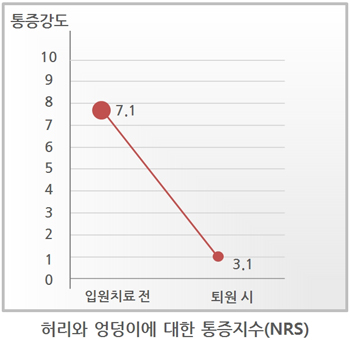 모커리한방병원은 2013년 1월부터 2014년 3월까지 척추전방전위증으로 입원한 환자를 대상으로 치료 전•후를 비교 분석한 결과, 복합척추치료 약 3주 후 환자가 느끼는 허리와 엉덩이 통증에 대한 통증지수는 7.1에서 3.1로 줄었으며, 통증 없이 걸을 수 있는 거리 역시 193m에서 3배가량 증가한 568m로 증가하였습니다. 이번 연구결과를 계기로 50% 밀려나간 2단계의 척추전방전위증 환자들에 대해서도 수술없이 충분히 치료될 수 있다는 것이 객관적으로 검증되었습니다.