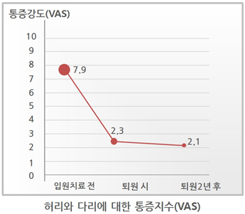 모커리한방병원은 3~4주간 입원집중치료를 받은 중증 척추전방전위증 환자를 대상으로 하여 퇴원 2년 후를 조사하였습니다. 그 결과 허리와 다리에 대한 통증이 줄어들고, 통증없이 걷는 시간도 꾸준히 증가함을 알 수 있었습니다. 이러한 연구결과를 2013년 중국 베이징에서 열린 세계재활의학회(ISPRM)에서 발표하여 객관적으로 입증하였습니다.
