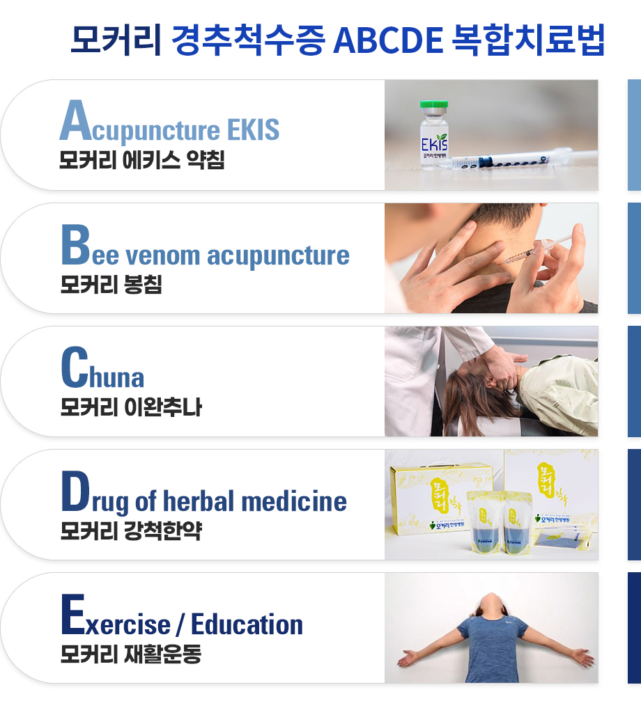 모커리 경추척수증 ABCDE 한·양방협진 재활치료법은 수술 없이 경추척수증을 치료하는 모커리 고유의 비수술 치료방법입니다. 경추척수증은 척수에 영향을 미치고 있는 목 주변의 단축되고 뭉쳐 있는 여러 근육들을 풀어주고, 그 근육들의 기능을 살려주어 잘 버틸 수 있게 해주면, 척수 신경압박이 줄어들면서 수술 없이도 증상이 호전될 수 있습니다.