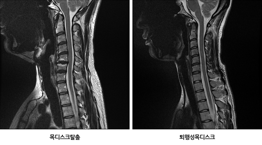 그런데 이때 퇴행성목디스크와 목디스크탈출증을 헷갈려 하는 분들이 계신데, 이 둘은 구별해줄 필요가 있습니다. 앞서 말씀드렸듯이 목의 전체적인 구조물이 퇴행된 상태를 퇴행성목디스크라 부르는데, ‘목디스크’란 단어가 들어가기 때문에 많은 분들이 목디스크탈출증을 떠올리십니다. 하지만 목디스크탈출증과 퇴행성목디스크는 구별해줘야 합니다. 목디스크탈출증은 디스크 외부를 보호하고 있는 섬유륜이 찢어져 수핵이 밖으로 밀려 나와 신경을 건드리면서 염증을 일으키고, 이로 인해 극심한 통증이 나타나는 급성기 상태를 말합니다. 목디스크탈출증은 목 통증과 함께 손과 팔 저림, 견갑골 안쪽 통증 등 극심한 방사통 증상이 함께 나타날 수 있는데요. 탈출된 목디스크는 치료를 잘 받으며 충분한 휴식을 취하면 밀려나온 디스크 수핵이 우리 몸으로 흡수되어 없어지는 경우가 많고, 파열이 심할수록 오히려 더 잘 흡수되는 경향이 있습니다.