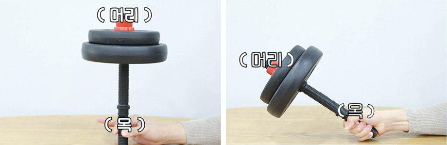 거북목 자세가 왜 목에 좋지 않은 지 위 사진의 덤벨을 예로 들어 쉽게 설명드리겠습니다. 덤벨의 위 부분을 머리, 덤벨을 잡고 있는 손을 목이라고 가정해봅시다. 덤벨 무게가 4kg 정도되는데요. 일반적으로 사람의 머리 무게가 4~5kg 정도 된다고 하니 덤벨과 비슷하거나 무게가 더 나간다고 볼 수 있겠죠. 덤벨이 첫번째 사진처럼 이렇게 똑바로 서 있는 상태라면 손가락만으로도 중심을 쉽게 잡을 수 있는데요. 반면, 덤벨, 즉 머리가 두번째 사진처럼 앞쪽으로 기울어진 상태라면 어떨까요? 덤벨을 붙잡기 위해 손, 즉 목에 엄청난 힘이 들어가게 됩니다. 이처럼 목이 앞으로 나가 있는 거북목 자세는 목의 뒤쪽 근육 및 인대가 앞으로 나간 머리를 계속해서 붙잡기 때문에 엄청나게 큰 하중을 부담하게 됩니다.