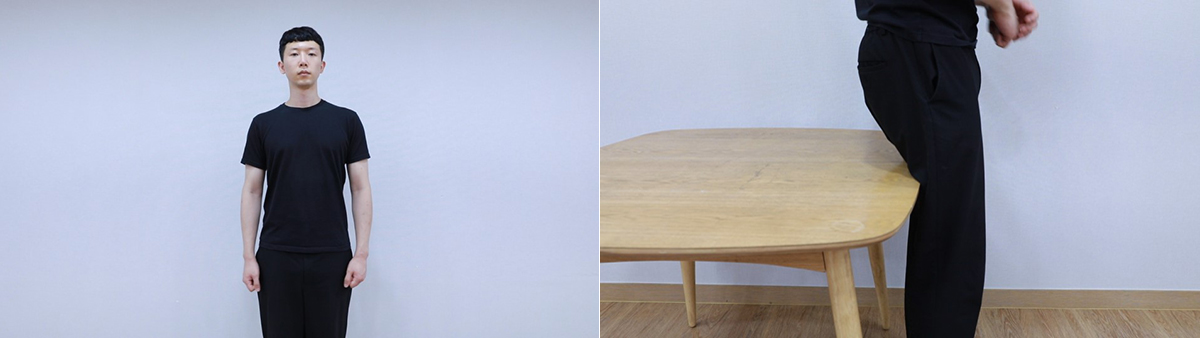 허리에 무리가 가지 않을 정도로 반듯하게 선 채, 고개를 들고 정면을 바라봅니다. 이때 운동을 하면서 골반이 도는 것을 막기 위해 엉덩이를 책상이나 테이블에 대고 서시길 추천합니다.