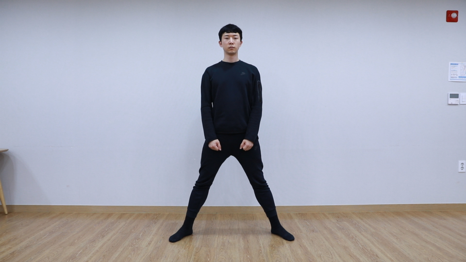 다리를 일반 스쿼트보다 더 넓게 벌리고 섭니다. 어깨 넓이보다 더 넓게 서는 겁니다.