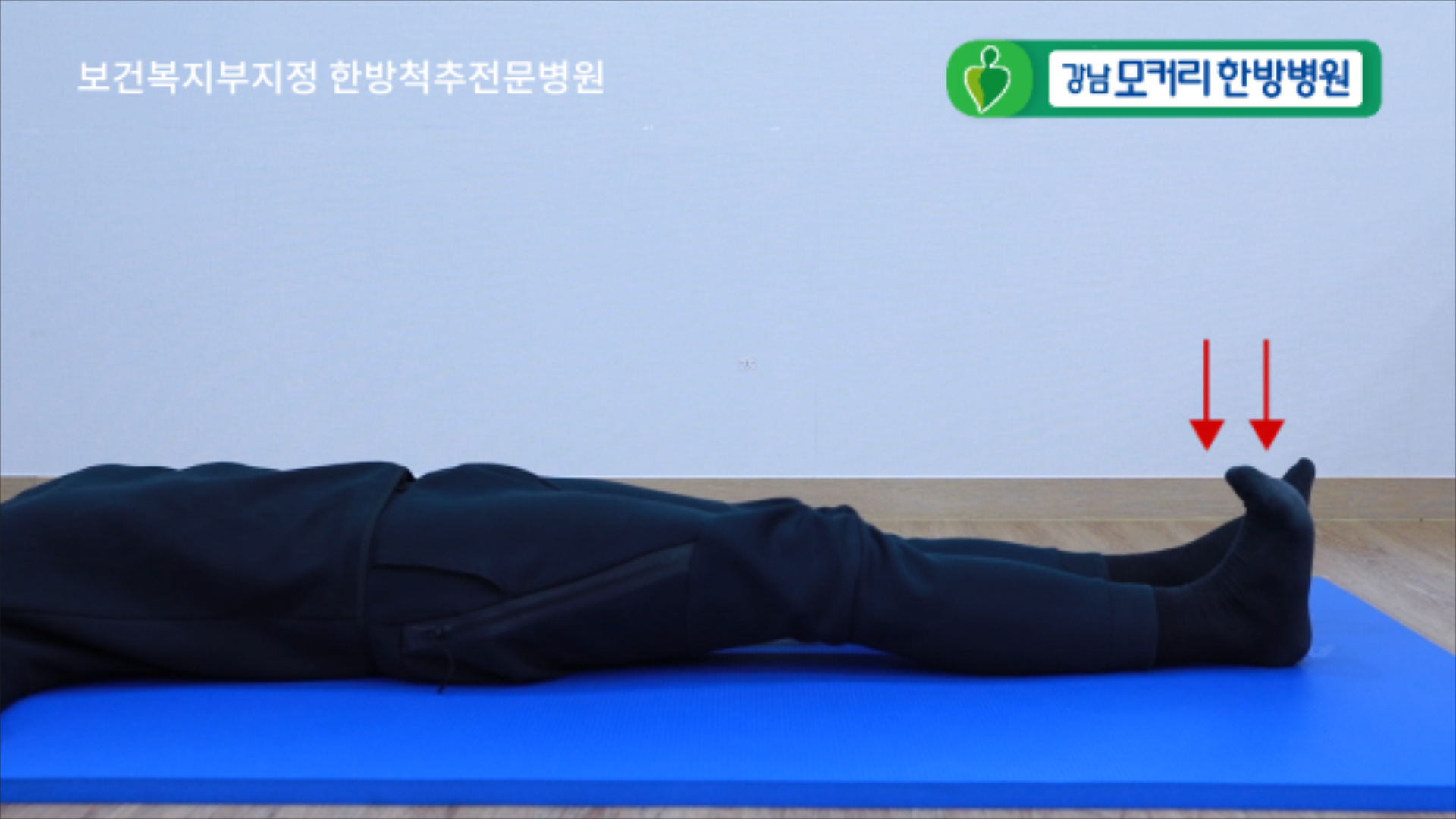 자연스럽게 누운 상태에서 두 다리를 가지런히 모아줍니다. 그 다음 발목을 움직여서 발끝이 몸 쪽으로 오도록 살짝 당겨줬다가, 그 상태를 잠시 유지한 다음 다시 처음 자세로 돌아오면 됩니다.
