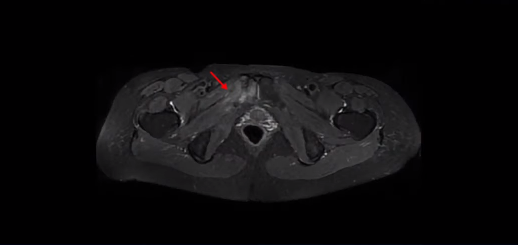 이 환자분은 아주 심하게 넘어지면서 엉덩이 근육이 파열되고 고관절에 미세 골절이 발생한 분입니다.