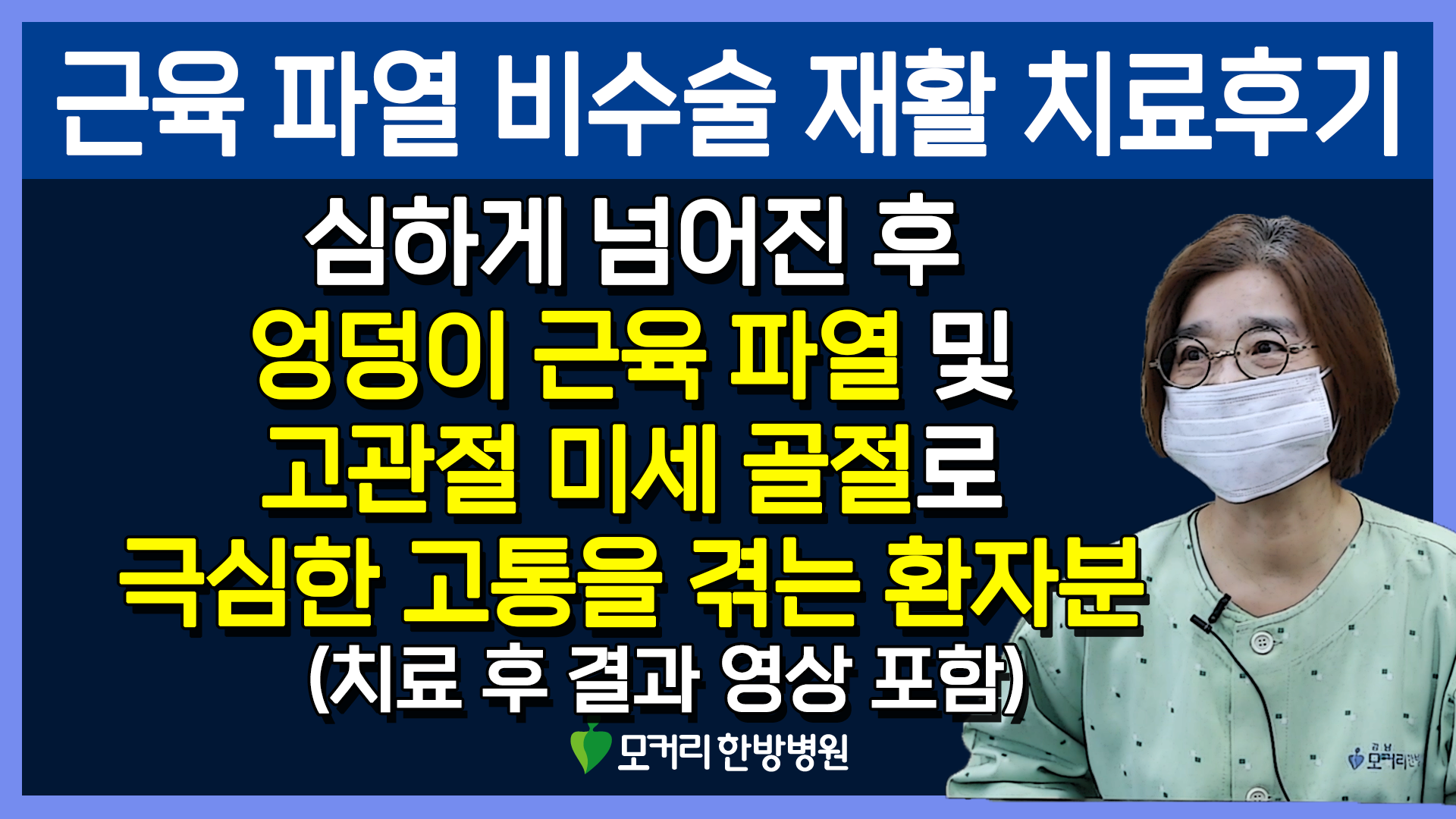 엉덩이 근육파열로 너무너무 아픈데 대학병원에서도 딱히 해줄 게 없으니 그냥 집에서 기다리라는 얘기를 듣고 너무 답답하고 어처구니가 없다고 생각하셨다고 합니다. 이런 근육의 문제는 양한방협진 재활치료로 해줄 수 있는 게 참 많습니다.