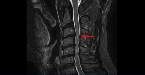 이 환자분은 목디스크 3, 4번의 심한 디스크로 인해 경추척수증이 발생한 환자입니다. MRI에서 보시다시피 심하게 밀려 나온 목 디스크로 인해 척수신경이 눌려서 신경이 손상된 게 하얗게 보입니다.