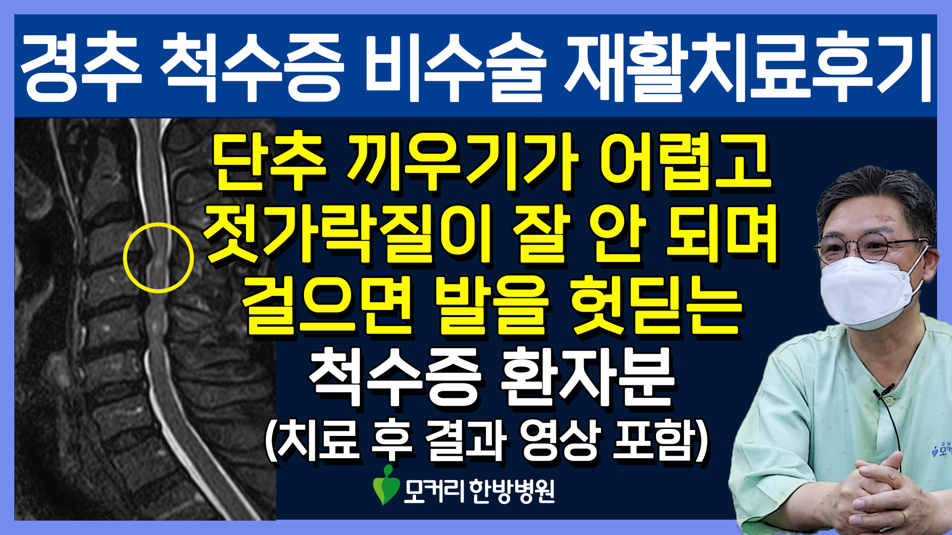 이 경추척수증 환자분, 젓가락질과 단추 끼우기가 어렵고 걸으면 발을 헛딛는다고 한 환자분의 재활치료 결과는 어떻게 되었을까요? 환자분의 재활치료 결과가 궁금하시다면 아래 썸네일을 클릭해 모커리한방병원 홈페이지에 로그인하신 후 치료 후 결과 영상을 꼭 보시길 바랍니다.