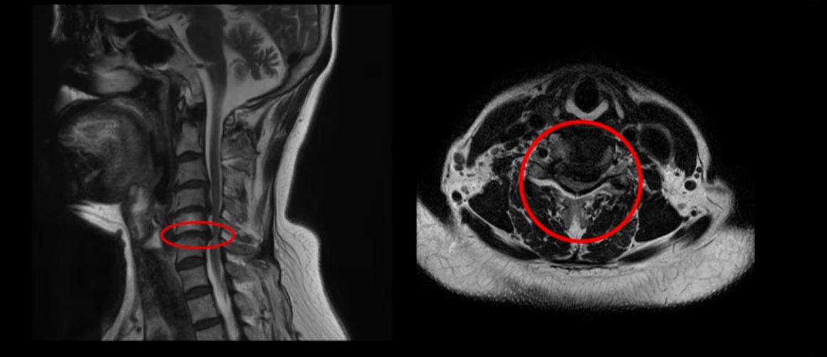 이 환자분은 목디스크 5번, 6번에 심한 디스크로 인해 경추척수증이 발생한 환자입니다. MRI에 보시는 것처럼 디스크가 심하게 밀려나와 이로 인해 척수신경이 눌려 신경손상이 하얗게 보입니다.