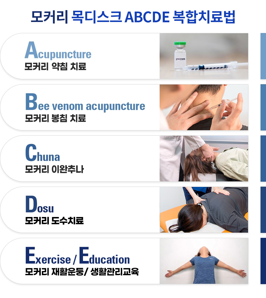 모커리 목디스크 ABCDE 복합치료법은 수술 없이 목디스크를 치료하는 모커리 고유의 비수술 치료방법입니다. 초기 목디스크는 물론 수술을 권유 받을 정도의 힘 빠짐이나 마비를 동반한 중증 목디스크까지 ABCDE 목디스크 비수술 치료법으로 치료하고 있습니다. 모커리는 일반적으로 목디스크가 허리디스크보다 비수술치료로 더 쉽고 빠르게 치료된다는 것을 연구하여 학술대회 등에 지속적으로 발표하고 있습니다.
