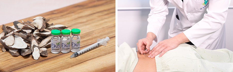경직된 척추관절 주변의 근육과 인대에 침을 놓아 혈액순환을 개선시켜주어 통증을 감소시켜주며, 퇴행으로 인하여 제 기능을 하지 못하는 근육과 인대를 유연하게 만들어줍니다. 파골세포 분화 억제용 또는 연골세포 분화 촉진용 조성물(SG-Ⅱ)로 특허 받은 강척한약을 정제한 약침액을 통증 부위의 경혈에 직접 주입해 염증 및 통증 제거뿐만 아니라 허리 주변 근육과 인대의 기능을 회복 및 강화시켜 줍니다.