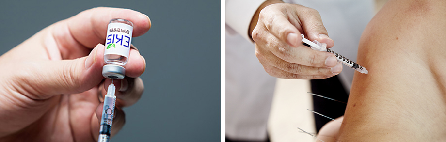 에키스 약침요법(Acupuncture of Herbal Medicine)은 정제된 약침액을 통증부위 경혈에 직접 주입하여 통증을 빠르게 감소시켜주는 효과가 있습니다. 특히 약침액은 염증 및 부종제거, 연골보호 및 뼈파괴세포 억제, 신경 재생 등의 효과가 객관적으로 검증되고, 파골세포 분화 억제 또는 연골세포 분화 촉진 조성물(SG-Ⅱ) 특허*를 받은 강척한약을 순수하게 정제해 조제한 것으로 더욱 신뢰할 수 있습니다. 에키스 약침은 마모된 무릎연골 부위에 윤활유 역할을 하여 약해진 무릎관절을 보호하는 데에도 효과적입니다.