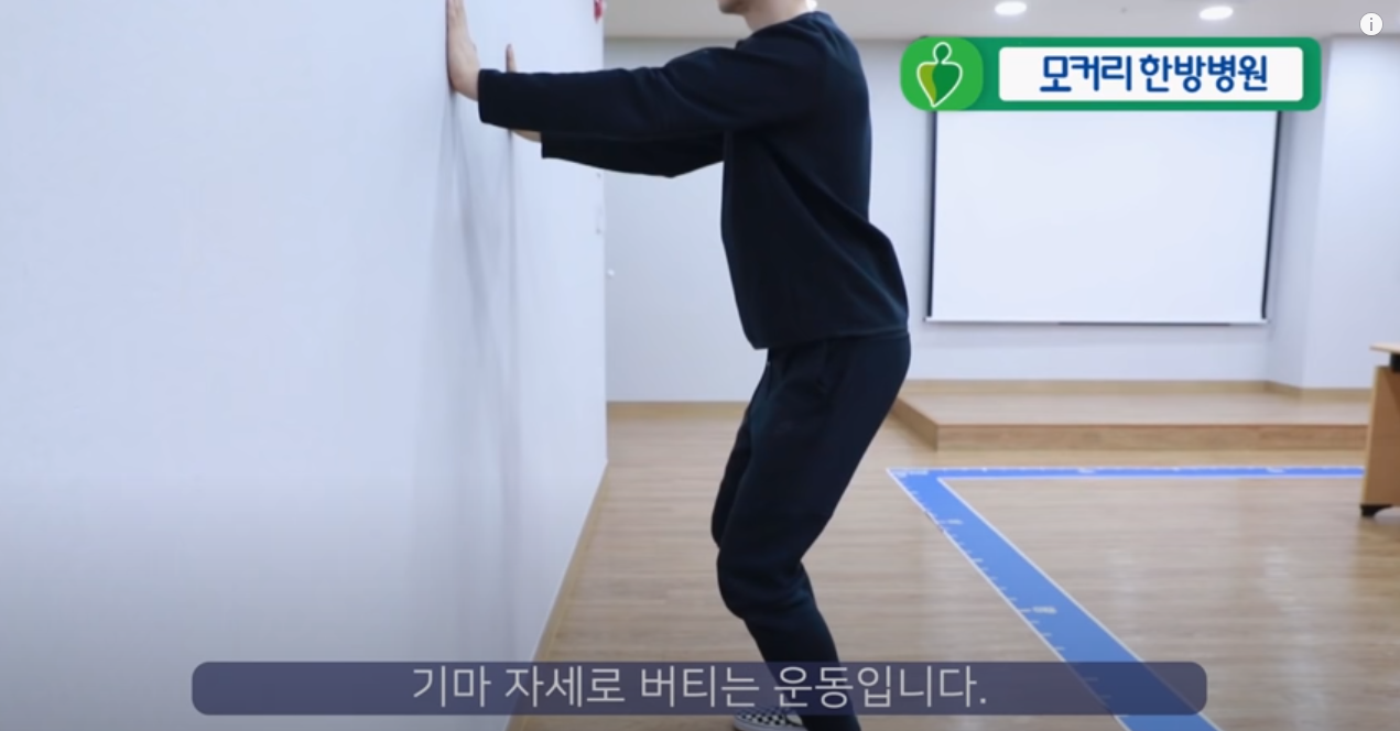 먼저 운동방법을 설명 드리겠습니다. 벽을 짚은 상태에서 다리를 어깨 너비로 벌리고 발은 일자로 섭니다. 여기에서 다리 안쪽 근육에 힘을 준다는 느낌으로 서는데, 이 허벅지 안쪽 근육을 내전근이라고 합니다. 대개 나이가 들면 바깥쪽 근육보다 이 안쪽 내전근이 많이 약해지고, 이 근육들이 약해지면 가만히 앉아 있을 때도 다리가 붙지 않고 벌어집니다. 때문에 이 안쪽 내전근을 살려주는 것도 매우 중요하므로 이 운동을 할 때에는 다리 안쪽에 힘을 주고 서야 합니다. 한편, 벽을 짚고 설 때는 가슴 높이로 해서 편하게 짚어주며, 손을 너무 위로 올리지 않도록 유의해 줍니다. 보통 이 자세를 취하면 일반적으로 협착증 환자는 상체가 앞으로 구부러질 텐데, 이렇게 허리가 살짝 구부러져도 상관없습니다. 이렇게 편안하게 벽을 짚은 상태에서 무릎을 살짝 굽혀 기마자세를 만들어주고, 무릎을 굽히는 정도는 본인이 편하게 느끼는 만큼 굽혀주면 됩니다. 그리고 난 후 이 무릎을 구부린 기마 자세로 버티는 운동입니다.