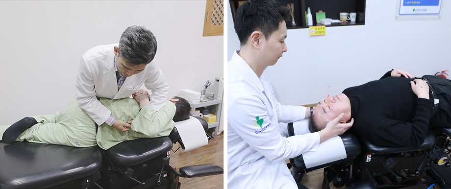 숙련된 전문의가 직접 손으로 척추 마디마디를 하나씩 부드럽게 밀고 당기어 흐트러진 척추관절의 균형을 맞추고 경직된 근육과 인대를 풀어주는 치료방법입니다. 이 과정에서 교통사고로 인한 충격에 의해 손상된 근육과 인대 그리고 그로 인한 근육통 및 결림 등의 증상을 치료합니다.