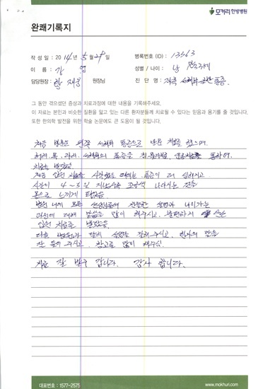 저는 허벅지 및 다리가 찌릿찌릿 아파서 걸을 수가 없고, 허리가 구부러져가는 상태에 있었습니다. 제주도 생활이라 의학정보가 부족하여 4년전부터 아파서도 치료할 길을 몰랐습니다. 여러병원에서 4년 동안 치료를 받아도 허벅지 다리가 아팠습니다. 그래서 자식들이 시간이 걸려도 한방병원 치료를 받아보자 권유가 ...