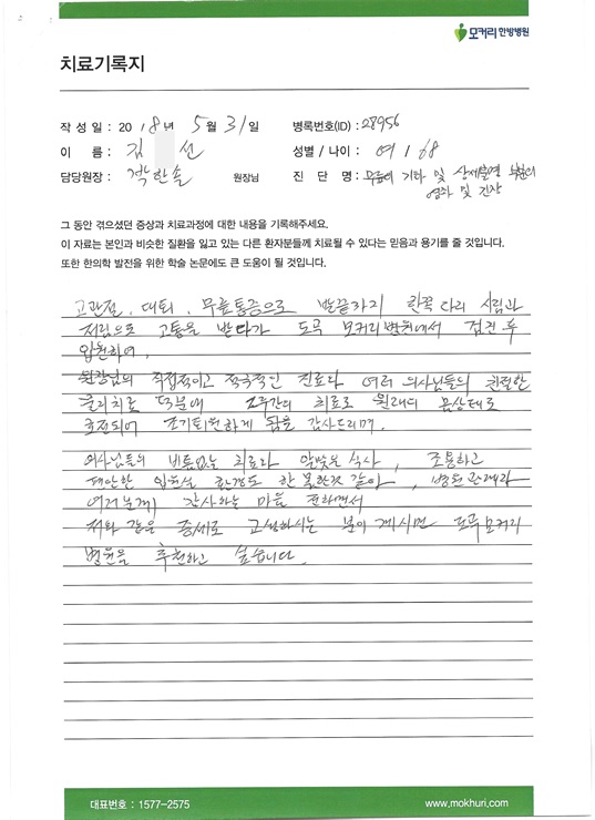 고관절, 대퇴, 무릎통증으로 발끝까지 한쪽 다리 시림과 저림으로 고통받다가 도곡동 모커리한방병원에서 검진 후 입원하여 치료를 받게 되었습니다.