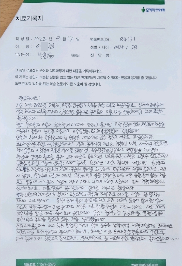안녕하세요? 저는 지난 2022년 5월초 퇴행성관졀염의 치료를 위한 오른쪽 무릎수술 후 집에서 회복 중에 생긴 허리와 오른쪽 다리의 갑작스러운 통증으로 걷지 못해 7월 15일 입원하게 된 50대 후반의 환자입니다. 평소 한의원의 이용이 많은 편이 아니어서 반신반의했지만 워낙 통증이 심해 무엇보다 화장실 ...
