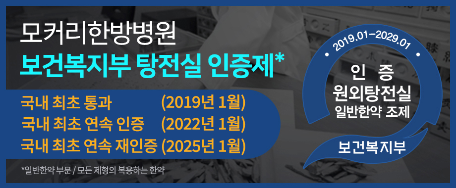 환자의 눈으로는 사용된 한약재의 품질이나 한약재의 정품여부, 정량사용, 안전성, 조제방식 등을 정확히 알기 어렵습니다. 이런 다양한 부분을 철저히 평가하여 믿을 수 있도록 인증하는 것이 바로 보건복지부 탕전실 인증제입니다. 모커리는 이렇게 좋은 품질의 한약을 만들기 위해 개원 초부터 부단히 노력해왔으며 이러한 노력들을 인정 받아 보건복지부 탕전실 인증제를 국내 최초통과(2019년 1월) 및 국내 최초 연속인증(2022년 1월), 국내 최초 연속 재인증 (2025년 1월)을 획득했습니다.