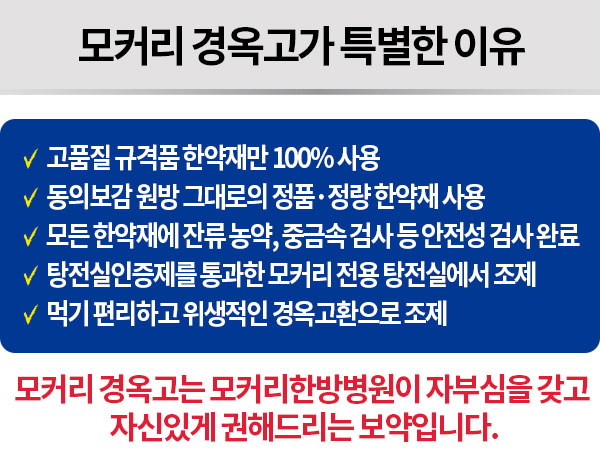 일반적인 경옥고는 고(膏) 형태로 되어 있기 때문에 숟가락으로 떠서 복용해야 하므로 다소 불편하고 비위생적입니다. 그런데 모커리에서는 경옥고를 24시간 동안 농축, 정제하여 환(丸) 형태로 조제하고 하나하나 개별포장했습니다. 이를 통해 여러분들께서 언제 어디서든 위생적이고 편리하게 경옥고를 드실 수 있도록 만들었습니다.