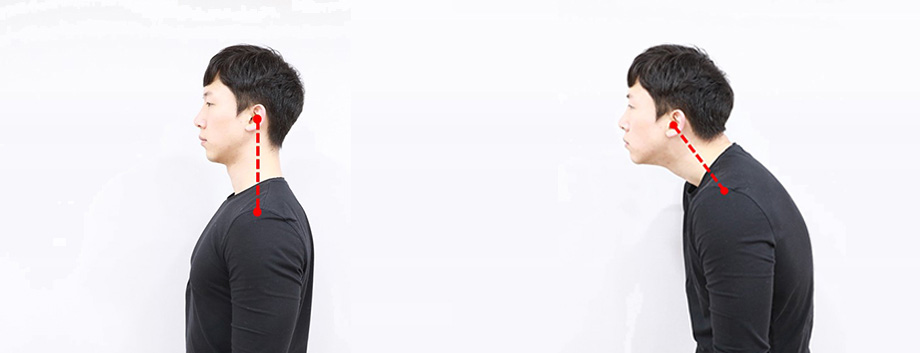 또 다른 거북목자가진단 방법으로는 다른 사람에게 부탁해서 옆에서 내 모습을 사진 촬영 해보는 것이 있습니다. 옆에서 내 모습을 찍었을 때 머리의 위치가 정상적인 상태인지 확인해봐야 합니다. 정상적인 목 상태라면 귀와 어깨의 중심선이 일직선으로 떨어지게 되지만, 정상적인 목 상태의 사진과 본인의 사진을 비교했을 때 귀가 어깨의 중심선보다 앞으로 나와 있다면 거북목을 의심해볼 수 있습니다.