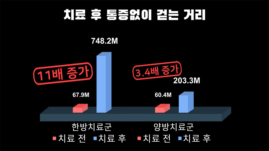 이번 협착증 임상연구는 총 743명의 협착증 환자를 모집한 후, 이중 통증 없이 걷는 거리가 평균 60m밖에 되지 않는 말기 협착증 환자 36명을 선정하여 연구를 진행했습니다. 이들을 침, 추나, 한약치료의 한방치료군과 스테로이드 주사, 물리치료의 양방 비수술치료군으로 나누어 4주간의 입원치료를 진행했습니다. 입원치료로 진행한 이유는 말기 협착증 환자는 잠시만 걸어도 통증이 발생하므로 통원치료로는 증상 개선이 어렵고, 통증치료와 더불어 약해진 근력을 회복하는 재활치료가 꼭 필요하기 때문입니다. 재활치료는 반드시 입원치료를 기반으로 해야 하기에 이 연구를 한방치료군, 양방치료군 모두 입원치료로 진행했습니다. 이렇게 연구를 진행한 결과, 치료 종료 6개월 후 한방치료군의 통증 없이 걷는 거리가 치료 전과 비교해 평균 11배 이상 증가했습니다. 이와 비교해 진통제와 스테로이드 주사 및 물리치료를 받은 양방 비수술 치료군은 통증 없이 걷는 거리가 3.4배 증가했습니다.