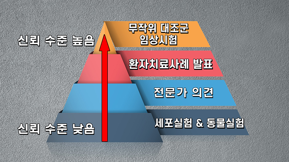 보통 논문에 발표되는 사람에 대한 의학적 치료 효과에 대한 연구의 종류는 매우 다양하고, 연구의 종류에 따라 신뢰도의 차이가 큽니다. 연구의 신뢰도가 낮은 단계인, 가장 초기 단계의 연구가 세포실험과 동물실험입니다. 이런 연구들은 실제 사람을 대상으로 한 임상에 쓰기에는 시간이 걸리는 아주 기초적인 단계의 연구라고 볼 수 있습니다. 그 다음으로 근거 수준이 높은 것이 전문가들의 견해와 환자 치료사례 발표입니다. 그런데 환자 치료사례 발표 연구는 과거에 치료한 결과로부터 자료를 얻는 것으로 치료가 잘된 사례만 모아서 발표할 수도 있기 때문에 100% 신뢰하기에는 무리가 있을 수 있습니다. 그래서 이러한 연구보다 훨씬 더 신뢰도가 높은 연구로 인정되는 것이 바로 무작위 대조군 임상연구입니다. 모커리한방병원이 발표한 협착증 논문이 바로 이 무작위 대조군 임상연구입니다.