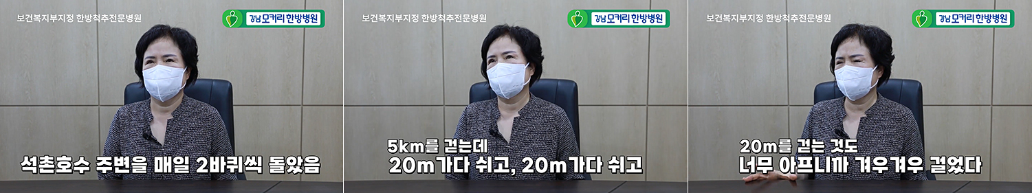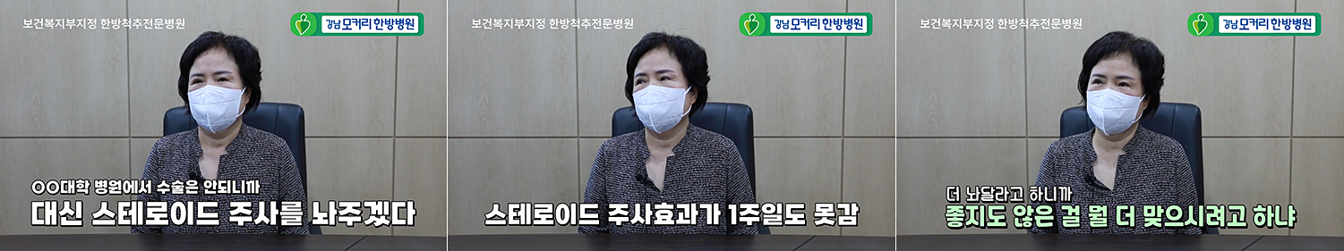 오늘 사례에서 보여드린 신경주사를 맞고도 계속 아파서 누워만 계셨던 환자분, 그리고 디스크가 터져서 걷지 못했던 환자분이 한 달 정도의 입원집중치료를 받으신 후 어떻게 변화되었는지 아래 영상을 보시길 바랍니다. 감사합니다.