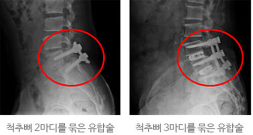 밀려나간 뼈를 강제로라도 제자리에 돌려놓으려고 한다면 척추유합술을 시행하는 방법이 있습니다. 척추유합술은 밀려나간 척추 뼈를 제자리에 밀어 넣고, 움직이지 않게 하기 위해 나사못을 박아 고정시키는 수술입니다. 전방전위증의 경우 이미 위쪽 척추 뼈가 아래쪽 척추 뼈보다 앞으로 밀려나가 어긋난 상태이기 때문에 다시 제자리로 당겨온다 해도 뼈는 불안정할 수밖에 없습니다. 그래서 척추의 안정화를 위해 뼈 위아래 마디 사이의 디스크를 제거한 후 나사못을 박아 고정시키는 유합술을 진행하는 것입니다. 수술을 통해 뼈를 제자리로 되돌릴 순 있지만, 뼈를 끌고 와 고정시키는 과정에서 근육과 인대 및 디스크 등 척추구조물은 많은 손상을 입게 됩니다. 또한 퇴행되어 약해진 디스크라도 완충 작용과 충격 흡수 기능이 남아있는데, 이 기능이 완전히 제거되기 때문에 보통 2~3년 정도 지나면 뼈의 위아래 디스크에 더 많은 부담이 가해지면서 퇴행이 가속화되어 인접분절질환의 발생 가능성이 높아집니다.