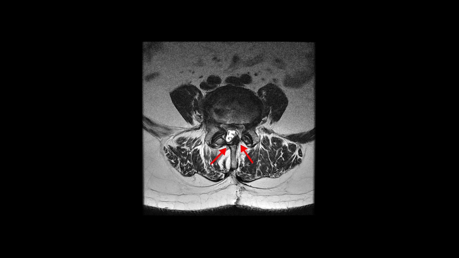 이 환자분은 허리수술을 여러 번 한 상태에서 결국에는 척추유합술까지 하셨습니다. MRI를 보시면 5번 1번 후궁에 수술한 자국이 보입니다.