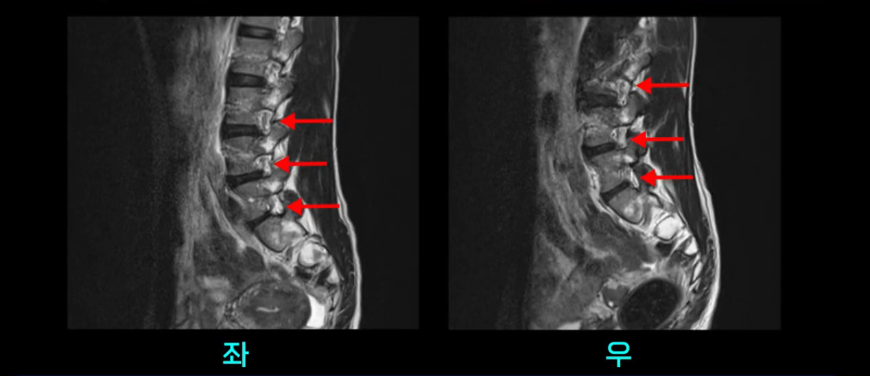 그럼 MRI를 봤으니까 이제 이 환자의 증상은 실제 왜 생기고 어떤 문제 때문에 아픈지에 대해서 차분히 설명을 드리도록 하겠습니다. 이 환자분의 진짜 통증의 원인은 무엇일까요? 이건 디스크의 문제가 아닙니다. 이 환자분의 진짜 통증의 원인은 허리의 기능이 완전히 무너진 겁니다. 허리의 기능 중에 가장 중요한 부분을 차지하는 게 근육인데, 일단은 근육 상태가 매우 좋지 않습니다. 그건 뭘 보고 알 수 있냐면, 이분은 앉지 못하고 양쪽 다리가 저리는 증상 발병 이전에도 아주 오랫동안 항상 허리가 뻐근하고 좋지가 않은 상태였습니다. 아주 오랜 기간 허리가 뻐근하고 안 좋은 상태였는데, 1년 반 전 어느 날 무리한 근력 운동을 한 후에 허리와 근육의 기능적인 문제가 한계선을 넘어가니까 더 심한 증상들이 쏟아져 나오는 거죠.