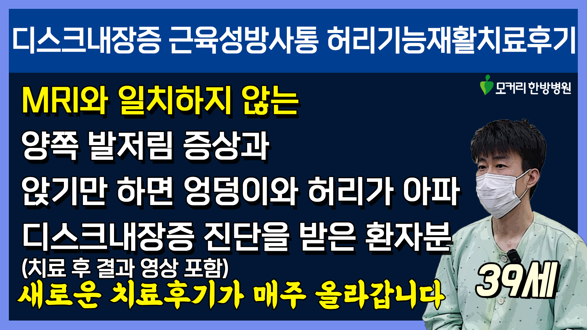 디스크내장증 근육성방사통 허리기능재활치료후기- MRI 와 일치하지 않는 양쪽 발저림 증상과 앉기만 하면 엉덩이와 허리가 아파 디스크내장증 진단을 받은 환자분