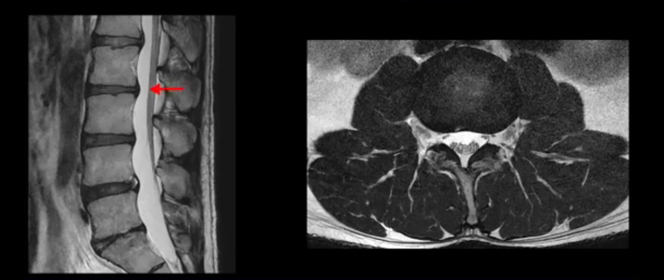 그런데 이분의 증상과 MRI가 전혀 일치하지 않는데, 왜 그런지 지금부터 자세히 설명드립니다. 이분 증상은 앉으면 엉치와 허리가 심하게 아파 10분 이상 앉는 게 어렵고 양쪽 발가락이 앉아있을 때나 누워있을 때 다 저립니다. 걸을 때도 아파서 10분 걷기도 어렵습니다. MRI를 마디마디 살펴보면 1번 2번은 오른쪽으로 살짝 밀려나온 디스크가 있지만 전혀 심하지 않고, 뒤에 또 설명하겠지만 최근에 밀려나온 급성 디스크가 아니고 오래된 디스크로 판단됩니다.