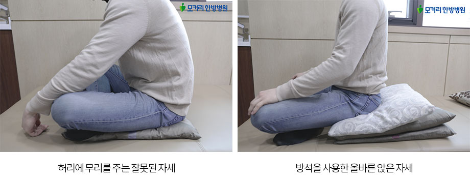 만약 어쩔 수 없이 바닥에 앉아야 할 때는 벽에 등을 기대어 앉거나, 화장실 또는 전화 등을 핑계로 자주 일어나는 것이 좋습니다. 그것조차 여의치 않다면 방석을 두세 개 정도 겹친 뒤 엉덩이 밑에 깔아 엉덩이가 다리보다 더 높이 위치하도록 앉는 것이 좋습니다. 이 경우 방바닥에 그냥 앉을 때보다 허리가 자연스럽게 펴지고, 요추 전만이 유지되기 때문에 통증이 완화됩니다.