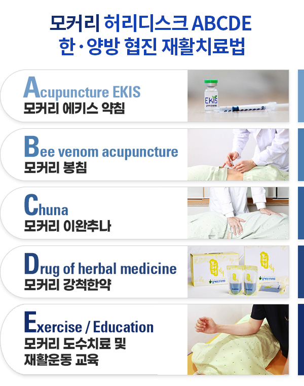 모커리 허리디스크 ABCDE 복합치료법은 수술 없이 허리디스크를 치료하는 모커리 고유의 비수술 치료방법입니다. 디스크 통증은 물론 수술을 권유 받을 정도의 마비와 힘 빠짐을 동반한 디스크 파열 등의 중증 허리디스크를 수술 없이 ABCDE 허리디스크 비수술 치료법으로 치료하고 있습니다. 모커리는 심하게 파열된 허리디스크 뿐 아니라 수술 후 재발한 허리디스크, 척추유합술 후 재발한 허리디스크 등의 어려운 척추 질환을 비수술로 치료하고 있으며, 이러한 ABCDE 치료법의 효과를 과학적, 객관적으로 검증하여 해외 유명학회 및 학술지 등에 지속적으로 발표하고 있습니다.