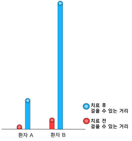 이게 평균적인 증가값이니까 상식적으로 생각해보면, 치료 전 조금만 걸을 수 있던 사람이 11배 증가한 거리를 걷는 것과 치료 전 많이 걸을 수 있던 사람이 11배 증가한 거리를 걷는 것은 결과에 굉장한 차이가 있다고 볼 수 있습니다. 그래서 협착증은 초기 치료가 중요한 것입니다. 모커리한방병원은 말기 협착증도 수술 없이 치료하지만, 그래도 가능하면 증상이 심하지 않을 때 치료를 받으시길 권유 드립니다.