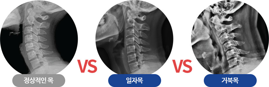 일자목이나 거북목과 같이 목뼈의 형태가 변형되면 머리의 하중을 그대로 받고 외부 충격이 목에 그대로 전달되어 통증을 유발할 수 있습니다. 일자목거북목은 간단한 X-ray 검사를 통해 진단 가능하며 거북목의 경우 귀가 어깨 중심라인 보다 앞으로 빠져나와 있어 외관상으로도 확인 가능합니다.
