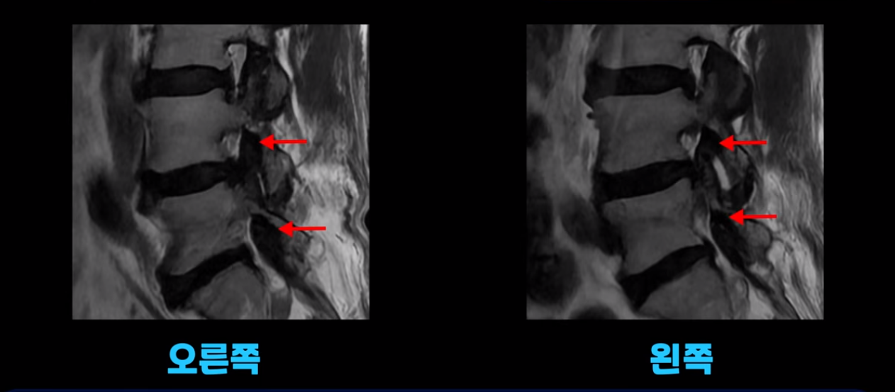 오른쪽 왼쪽 신경 가지가 나가는 추간공도 좁아져는 있지만 아주 심하지는 않습니다.