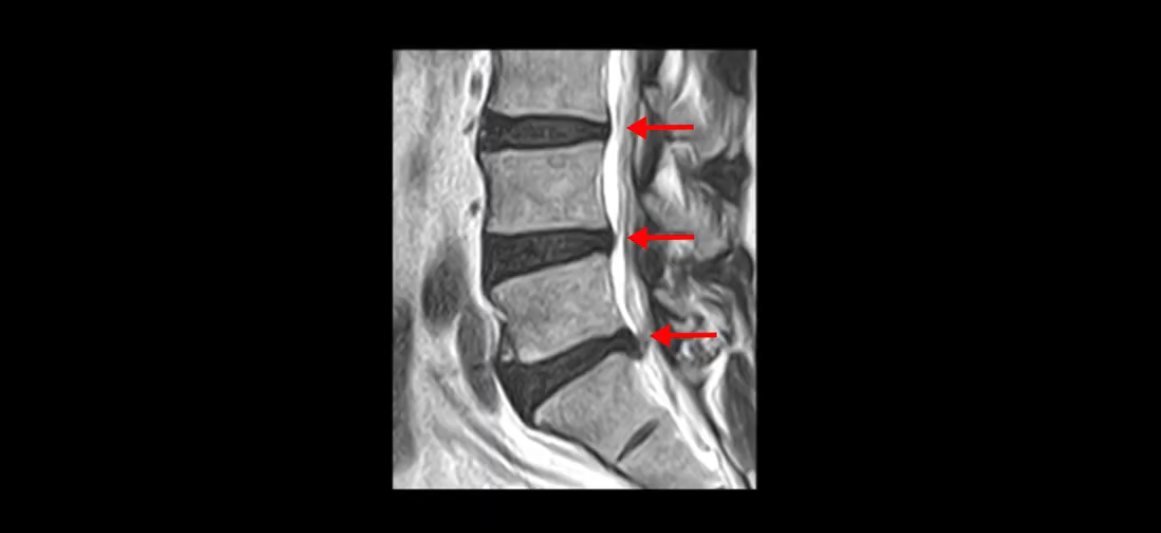 우선 이분 MRI를 잠깐 볼까요? 세 마디의 퇴행성 디스크가 있고