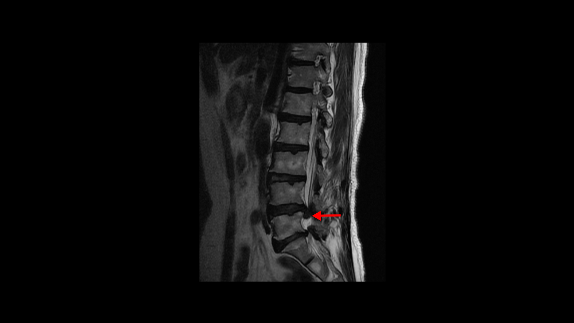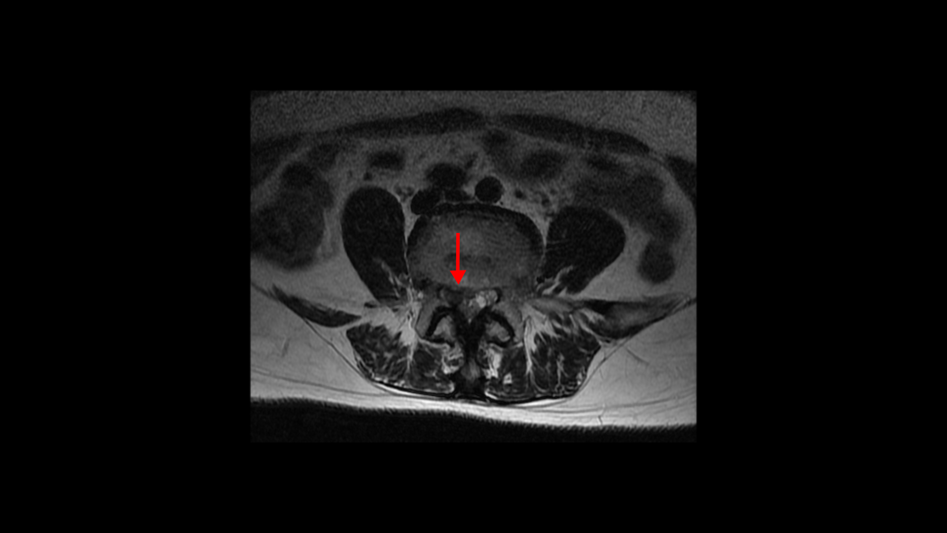 이분은 약 4달 전에 디스크가 갑자기 파열됩니다. MRI를 보면 4번 5번 디스크가 터져서 밀려나온 수핵이 아래로 흘러내려 있습니다.