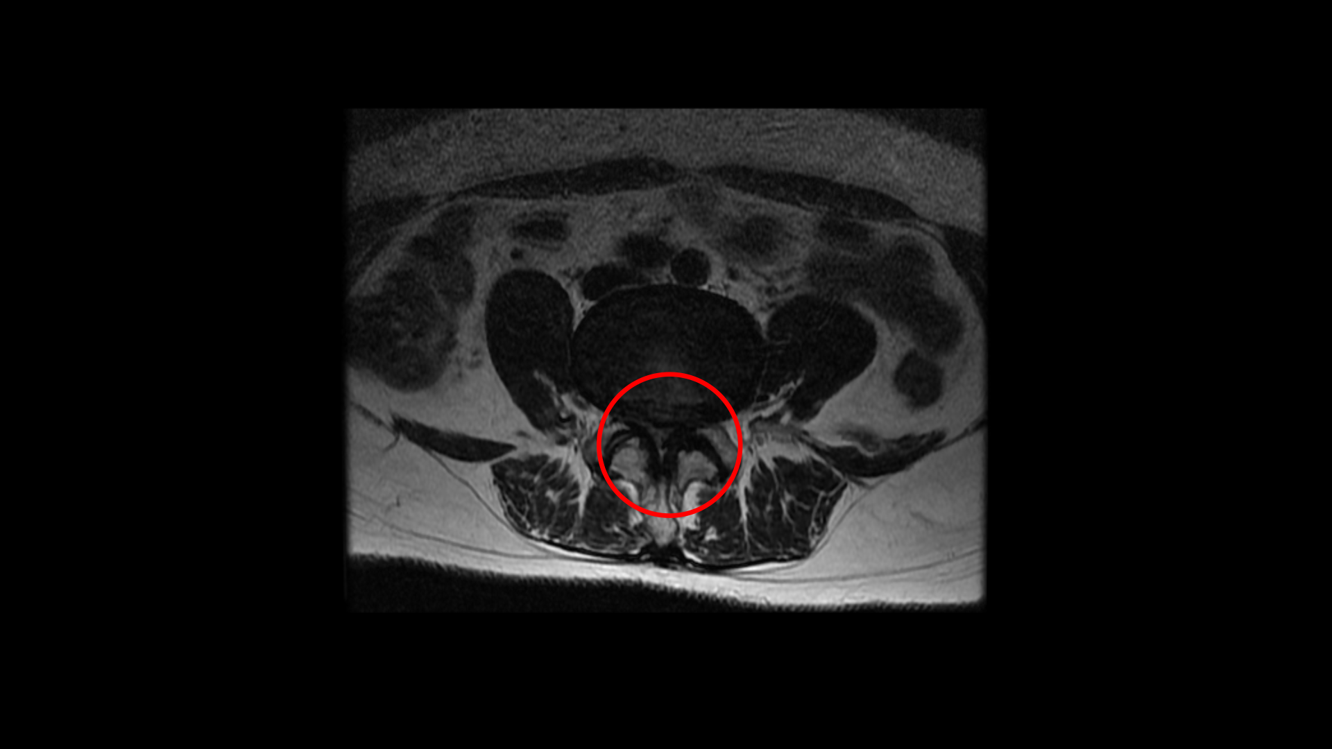 축상면에서 보면 흘러내린 수핵이 신경이 있어야 할 자리를 차지하고 있는 것이 보입니다.