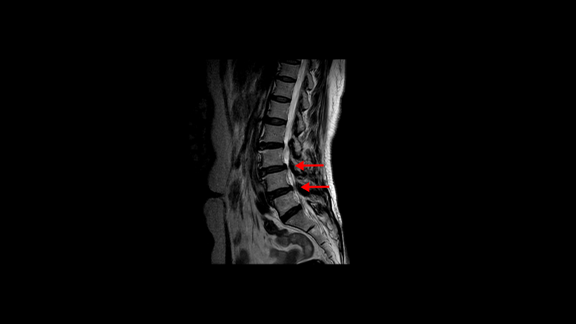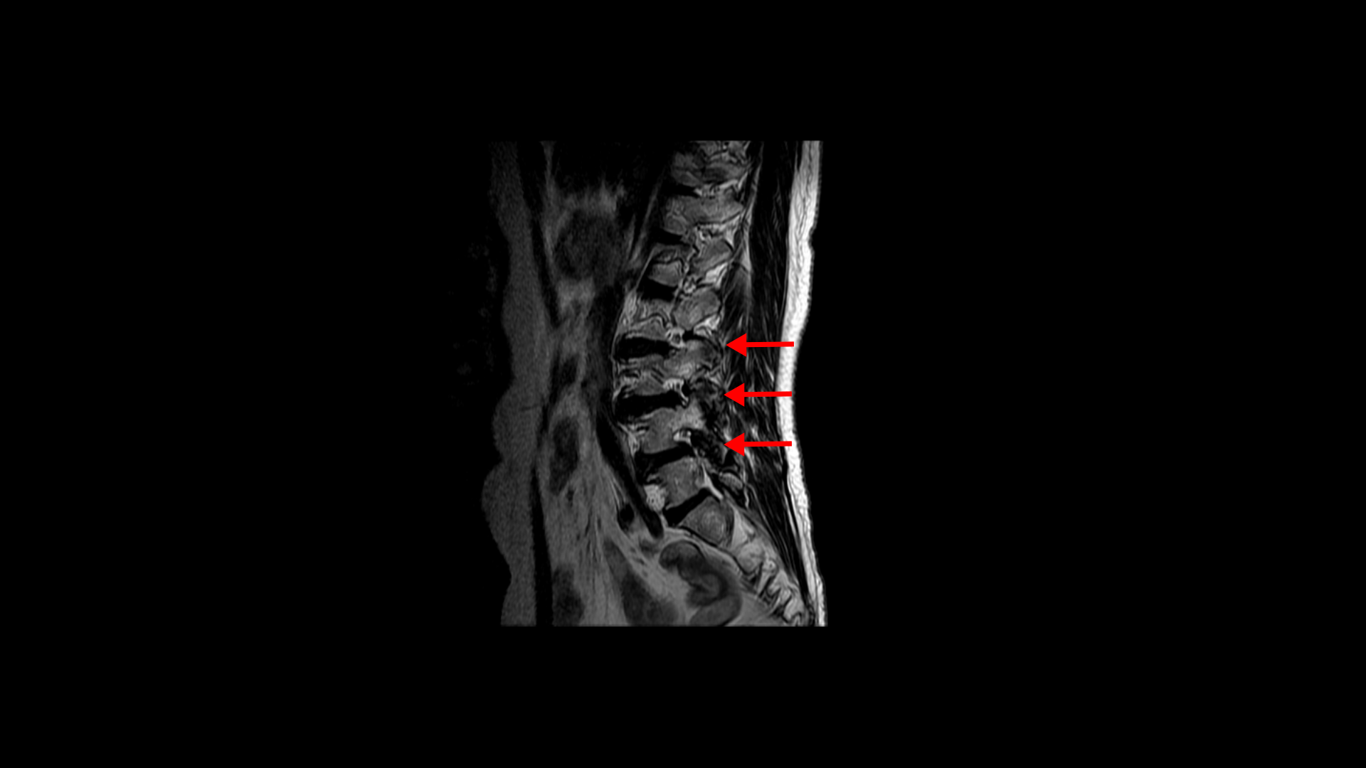 우선 이 환자분의 MRI를 함께 보겠습니다. 이 환자분의 척추에는 3번 4번과 4번 5번에 각각 1단계의 전방전위증이 있습니다.