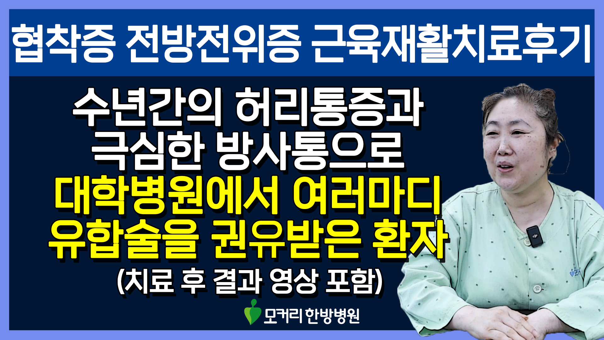 여기 오기 전까지만 해도 주사량을 생각하면 30번은 넘어요. 대학병원 선생님도 세 번을 놔주셨고 조금이라도 더 놔야지, 더 놔봐야지 해서 조그마한 병원, 일반 병원을 이 병원 저 병원 다니면서 그런 주사까지 다 맞았어요. 그런데도 주사치료 효과는 없었어요. 없었으니까 여기 모커리까지 오게 된 거죠.