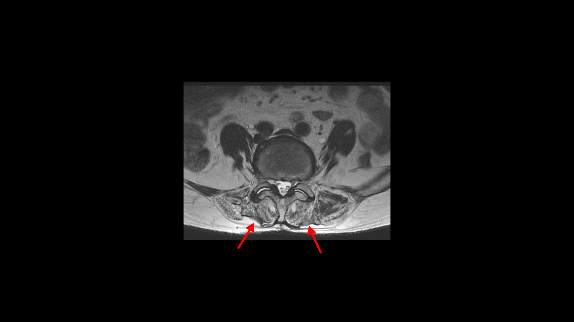이 환자분의 일어서면 허리가 구부러지고 다리가 아파 걷기 어려운 이유는 근감소증 때문입니다. 특히 근육 중에서도 MRI에서 보면 허리 뒷부분에서 허리를 펴주는 근육인 기립근이 보시다시피 하얗게 지방으로 변해있습니다.