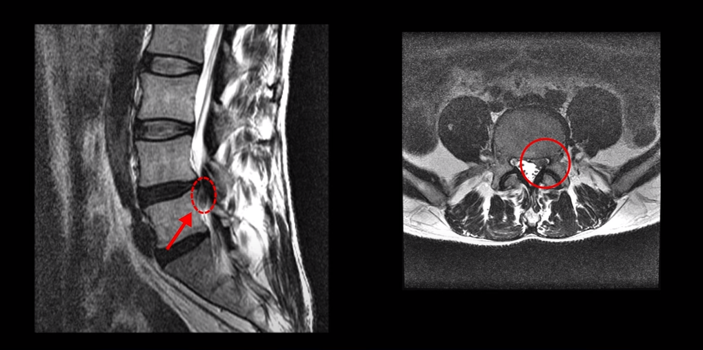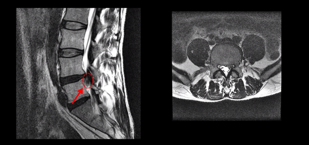 수핵이 왼쪽으로 밀려나와 있어서 극심한 왼쪽 다리 방사통과 감각 마비가 있습니다.