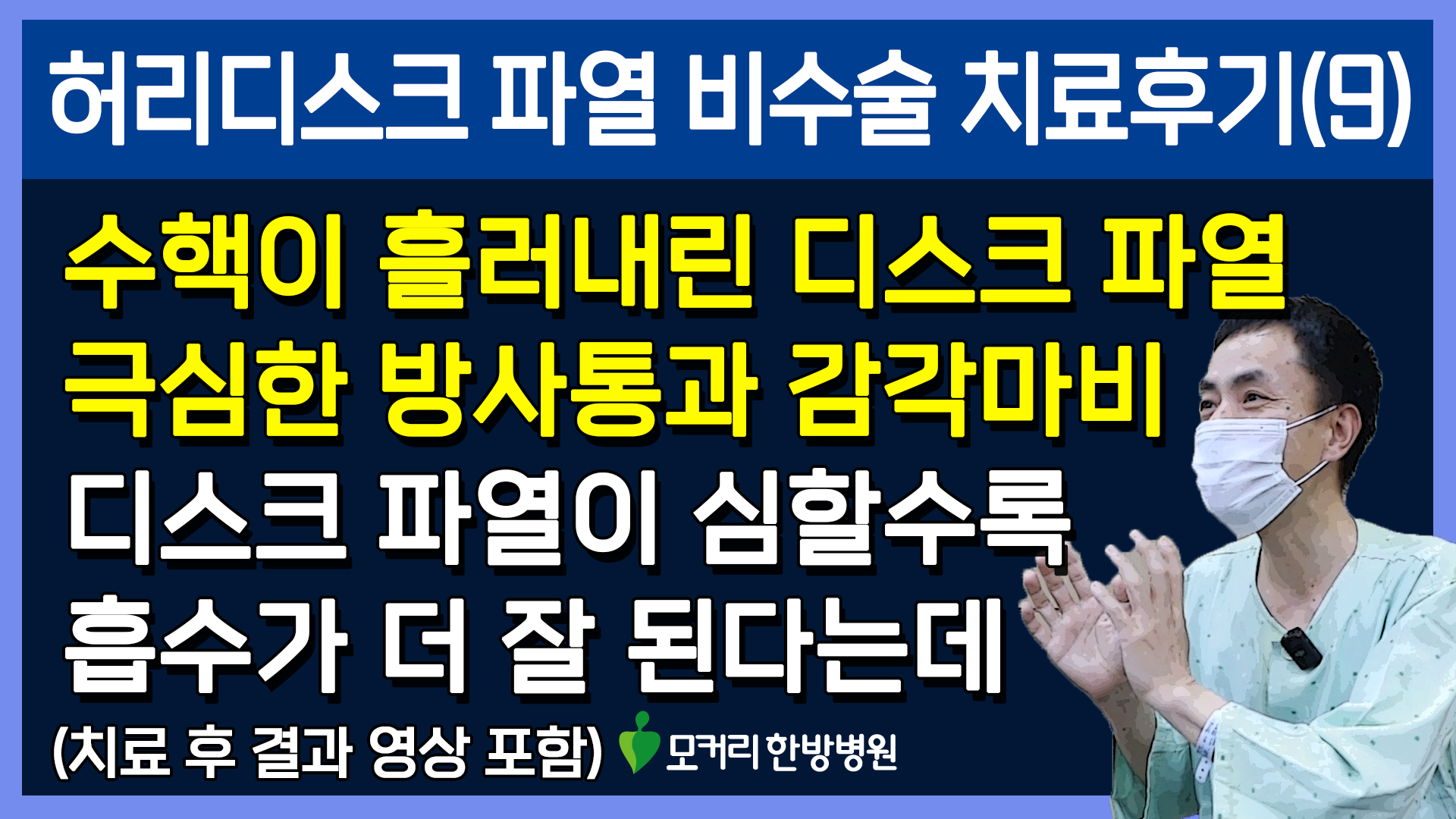 저희 모커리는 수많은 영상을 통해 디스크 파열이 심하면 심할수록 흡수가 더 잘 될 가능성이 훨씬 높다고 계속 말씀드리고 있습니다. 역설적이게도 디스크 파열이 심할수록 깨끗하게 자연치유 될 가능성이 훨씬 더 높은 겁니다. 그래서 이런 극심하게 디스크 파열이 된 환자분들이 내원하시면 저희는 오히려 더 확신을 가지고 자신 있게 말씀 드립니다. 비수술 치료가 잘 될 가능성이 매우 높으니까 한 달 정도만 치료에 전념하시라고요.