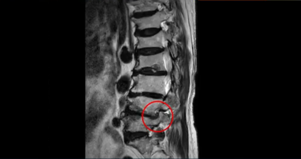 이 환자분은 허리 여러 마디가 다 안 좋아서 오랫동안 허리가 아프셨고 허리도 일찌감치 굽으셨습니다. MRI를 보시면 허리 여러 마디가 심하게 안 좋습니다.