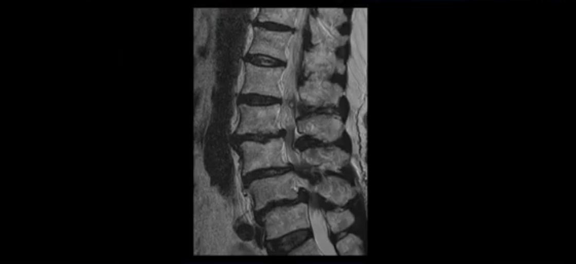 이 환자분 MRI를 보면서 더 자세히 설명 드리겠습니다. 이분은 허리의 다섯 마디가 다 안 좋은 환자분입니다. 84세 고령의 나이에 이렇게 여러 마디가 안 좋으면 대학병원에서도 수술이 어렵다는 얘기를 듣는 경우가 많습니다. 또 수술을 하더라도 결과가 안 좋을 수 있다는 얘기를 들을 가능성이 높습니다.