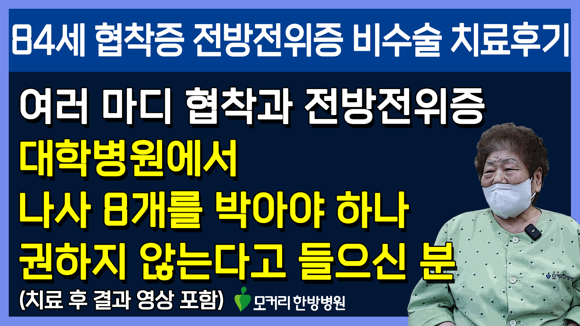 여기 오려고 머리 하러 미장원에 갔더니 미장원에서 ‘아이고 그런데 가면 돈만 쓰지 절대 안 낫는다’고 수술을 하려고 날짜를 잡아놨으면 수술을 하지 왜 한방치료 하냐고 말리더라고요.