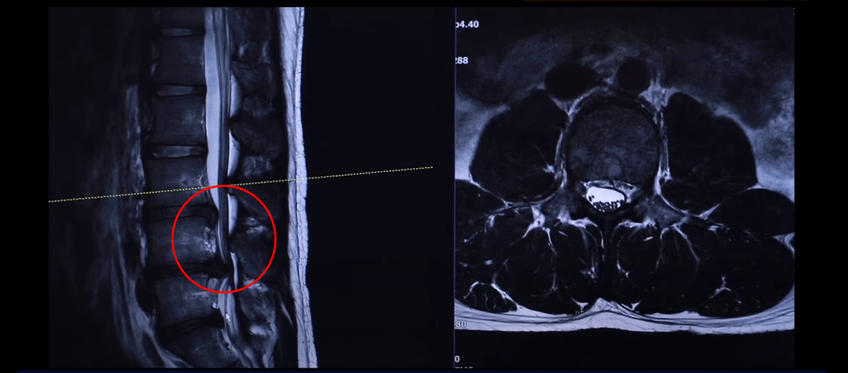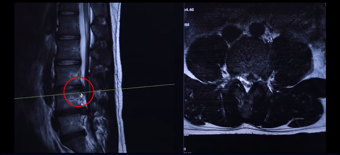 왼쪽 다리에 참을 수 없을 정도로 심한 방사통이 생긴 겁니다. 이분이 디스크가 왜 터졌냐? 24살이신데 어릴 때부터 허리가 아팠습니다. 고등학교 때부터 오랫동안 허리가 아팠기 때문에 나이에 맞지 않게 세 마디가 벌써 퇴행돼 있죠. 군대 때도 아팠고 최근에 중량 스쿼트, 웨이트 트레이닝 하다가 디스크가 터지게 됩니다. 웨이트 트레이닝 하다가 다리가 이상한 걸 느껴서 병원에 가서 MRI를 찍어 보니까 이렇게 심하게 터져 있습니다. 보통 이렇게 심하게 터져 있으면 어느 병원을 가든 정형외과나 신경외과에서 수술을 해야 된다 이런 얘기를 들을 가능성이 있습니다.
